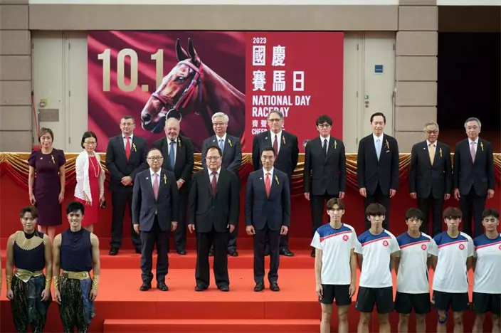國慶賽馬日開幕儀式在沙田馬場馬匹亮相圈舉行,外交部駐港特派員公署副特派員潘雲東(第二排中)、香港賽馬會主席利子厚(第二排,右)、香港賽馬會副主席廖長江(第二排,左)及一眾董事(後排)一同為開幕儀式主禮。