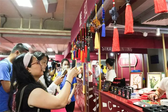 入場人士在「古藝市集」探索麥稈畫、剪紙、面塑及盤扣四大中式工藝。