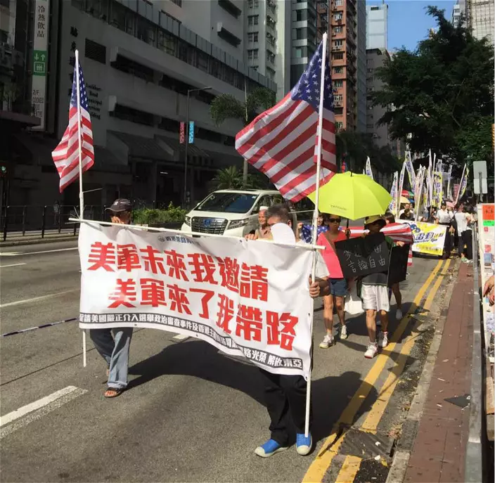 據網上新聞報道,話參加遊行者有數人高舉港英旗及美國國旗, 要求外國政府介入跟進事件。