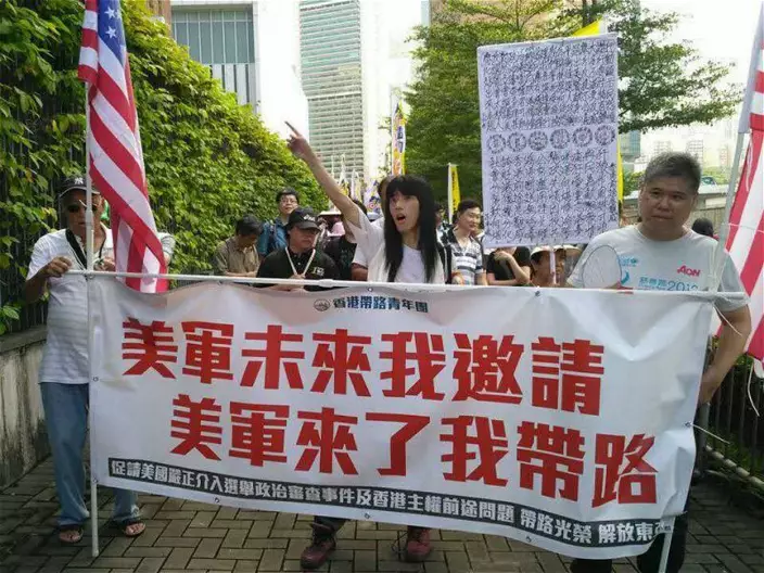 有朋友傳來一兩張圖片,應該是昨日拍的照片,有遊行人士打起「 美軍未來我邀請 美軍來了我帶路」的口號,都相當得人驚。橫額上書「 促請美國嚴正介入選舉政治審查事件及香港主權前途問題, 帶路光榮,解放東亞」。署名「香港帶路青年團」。