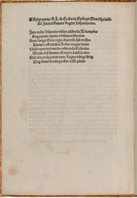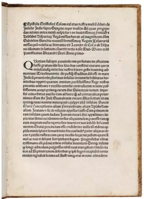 哥倫布在信件寫著「我帶著國王和王后給予我的艦隊,航行到了東印度群島,在那裡我發現了許多島嶼和無數的居民。」哥倫布當時並不知道他是繼維京人之後首個到達北美的歐洲人,還以為自己來到了原先的目的地東印度群島。