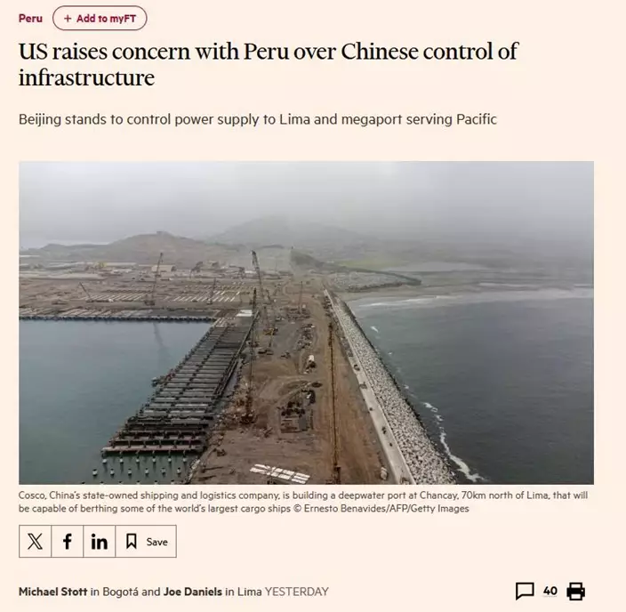 英國《金融時報》3日引述一名美國高級官員炒作稱,中國在秘魯的投資規模及其戰略地位引起了美方的「特別關注」,並已向秘魯「直接表達」了對於中國正在「控制」該國部分關鍵基礎設施的擔憂。