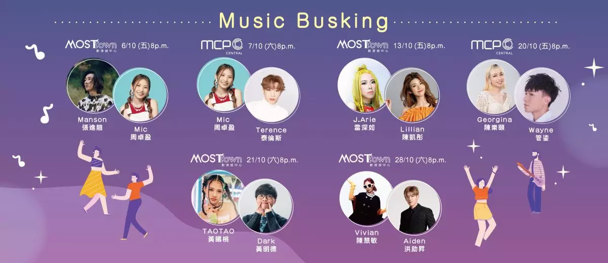 恒基地產旗下兩大商場將軍澳 MCP 新都城中心及馬鞍山MOSTown新港城中心全力響應政府「香港夜繽紛」活動,舉辦「After 8 Music Night Carnival」,由10月6日開始,兩大商場將於十月內舉行一連六場Busking夜間音樂表演。今次更成功邀請到11位人氣唱作歌手及音樂人到場大展歌喉,以音樂打造至Chill 氛圍,與市民以音樂共度狂歡夜晚!