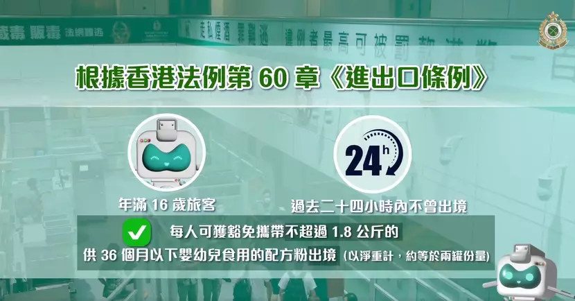 根據香港法例第 60 章《進出口條例》,旅客攜帶供 36 個月以下嬰幼兒食用的配方粉 (包括奶粉或豆奶粉) 出境,如沒有獲發出口許可證或獲得豁免,均屬違法,最高罰款港幣500,000元及監禁 2 年。年滿 16 歲旅客如在過去24小時內不曾出境便可獲豁免,每人可攜帶不超過1.8公斤的配方粉 (以淨重計,約等於2罐份量)。