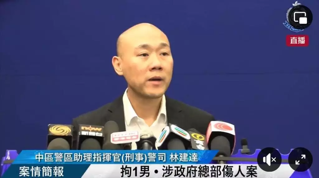 案情指,被捕男子星期三上午約9時10分,單獨離開秀茂坪嘅住所,大約十點,乘港鐵到達金鐘站,前往政府總部門外案發現場,用一把相信由家中帶去的生果刀,襲擊政府總部的保安人員。警方接報後兩分鐘到達現場,並且即場拘捕一名中國籍男子。