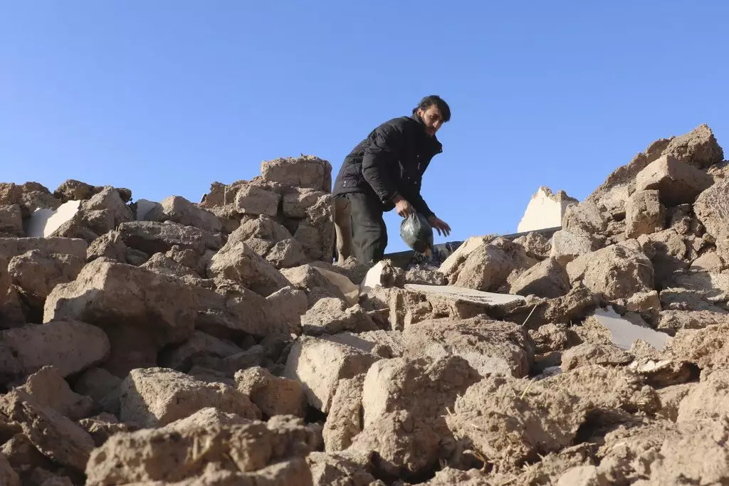 罹難家庭的鄰居尼亞茲(Mohibullah Niazi)在阿富汗喀布爾(Kabul)市郊的伊蒂法克(Ittefaq)村,地震損毀房屋旁堆放的物品中翻找,攝於2026年4月4日周六。(美聯社圖片/Siddiqullah Alizai) AP圖片
