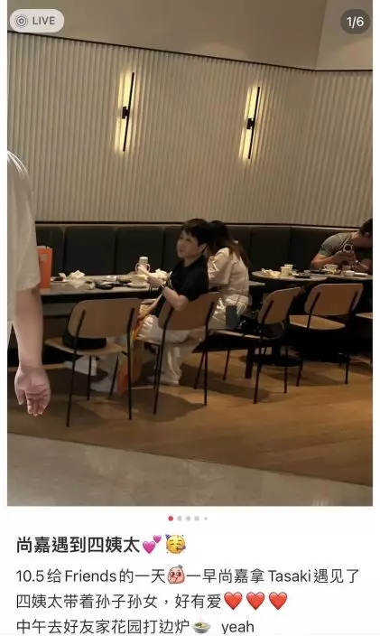 有網民捕獲到在上海湊孫的四太,並表示她帶着孫仔孫女畫面好有愛,po出兩張相片,相片中四太休閒穿搭坐在餐廳,她一直看著小朋友的一舉一動,更拿著兔仔公仔與孩子互動,還露出慈祥的笑容!