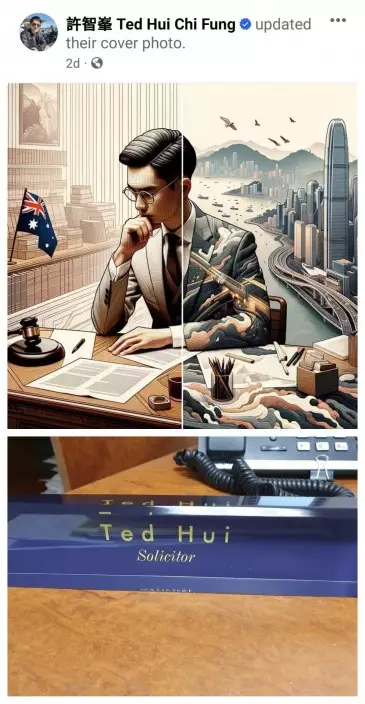 為了突顯他正式變身律師如何威水,他在帖文中 post了工作桌上一個寫着「Ted Hui ,Solictor」的水晶名牌,並將 Cover 相換成自己在律師樓辦公的畫像,旁邊還刻意擺了一支澳洲國旗。