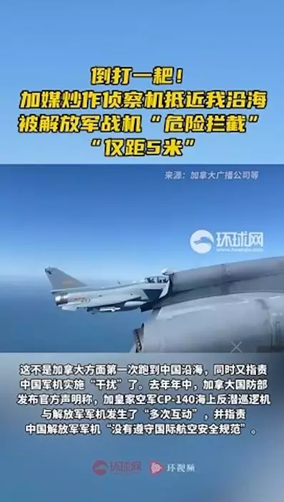 加拿大廣播公司(CBC)16日援引加空軍消息,炒作中國戰機以所謂「不安全不專業的方式」對加拿大偵察機實施攔截。該消息稱,事發時間是本周一(16日),而事發地則在中國沿海。