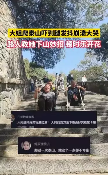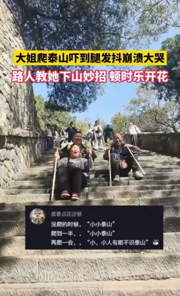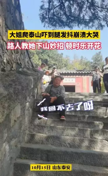 日前,山東泰安一名大姐因爬山而崩潰大哭的影片在微博上瘋傳。當天該名大媽爬上泰山後要下山時,卻因懼高腿抖而坐在階梯上崩潰大喊:「我回不去了,別盡拍俺啊」。然而當她遇到一批下山的遊客後,心情卻發生了巨大轉變!
