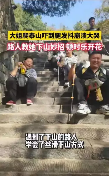 影片可見,一群遊客大方地分享了他們下山「神招」,只見他們帶著大媽一起雙手撐著登山棍,隨後坐在階梯上一節一節往下挪動,而原本心情沮喪的大媽也瞬間笑得燦爛起來,其畫面相當歡樂!