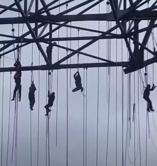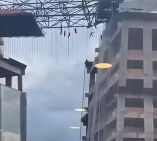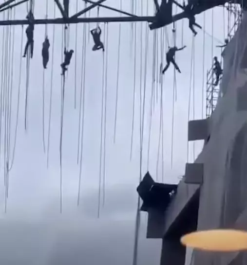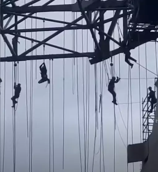 工人們在半空中瑟瑟發抖,但也只能緊緊抓住繩索,盡量保持鎮靜等待救援。影片中可見,高塔恰好倒塌在旁邊的建築物上,才讓眾人沒有當場死亡,然而高掛在數百米的高空中的滋味一定相當可怕。