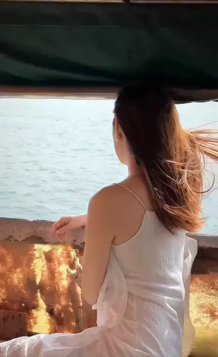 身穿白色吊帶連身裙的她,坐在船上望著靚景