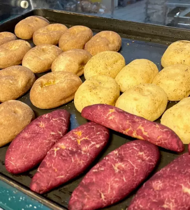 這款薯仔麵包一盒有四個,定價為人民幣18.9元(約20港元),是該超市烘焙師傅自主研發的產品,它的外層柔軟且有彈性,餡料中馬鈴薯的含量超過50%,外形非常可愛,而且還有番薯、紫薯等不同口味可供選擇,每種口味都和本尊外形看起來一模一樣。