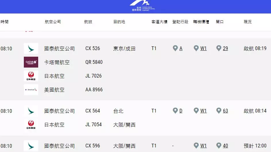 據機管局網頁資料顯示,CX596航班現況為預計中午12時再次起飛。