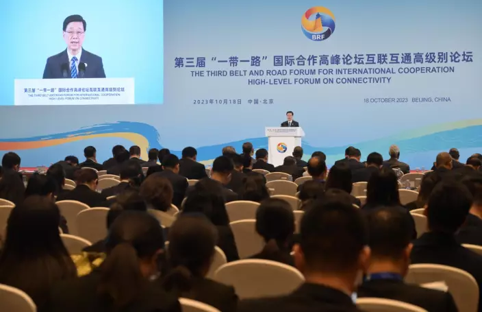 香港70人代表團參加「一帶一路」論壇,為歷來最高規格,特首李家超在論壇上致辭(政府新聞處圖片)
