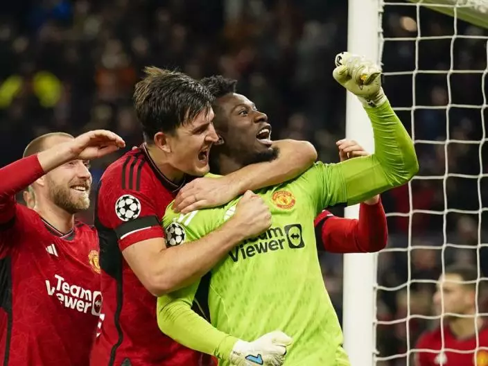 麥佳亞與奧拿拿賽後慶祝曼聯於歐冠分組賽的勝利。AP圖片