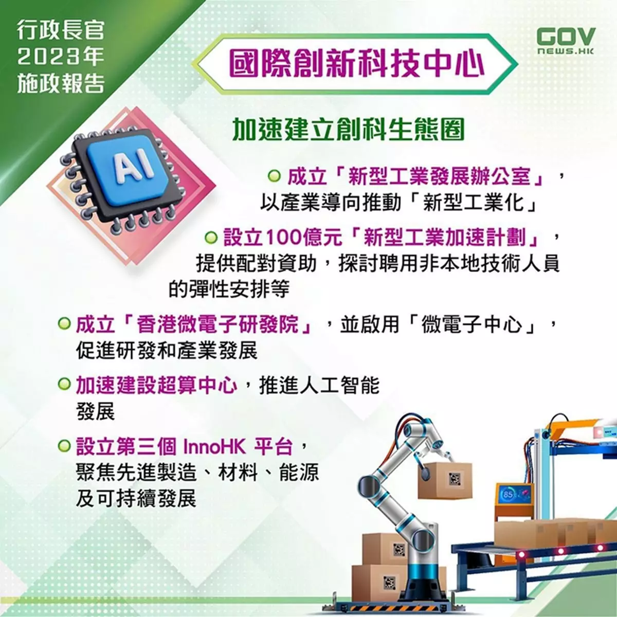 國際創新科技中心:進一步落實《香港創新科技發展藍圖》,加速建立創科生態圈。
