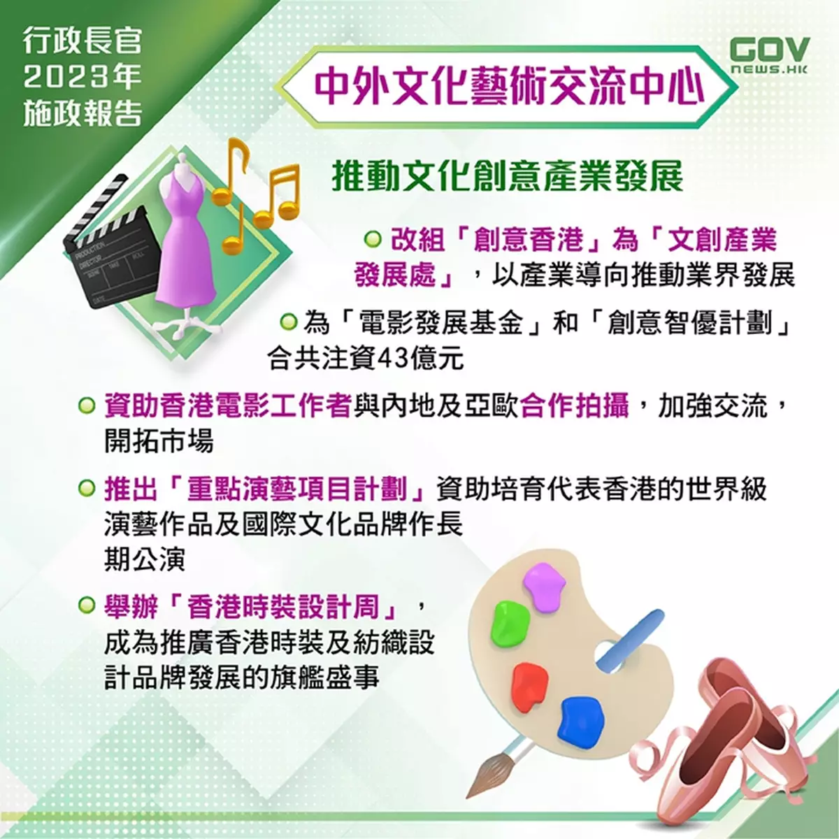 中外文化藝術交流中心:公布和推展《文藝創意產業發展藍圖》,全力推動文化創意產業發展,包括為「電影發展基金」和「創意智優計劃」合共注資43億元等。