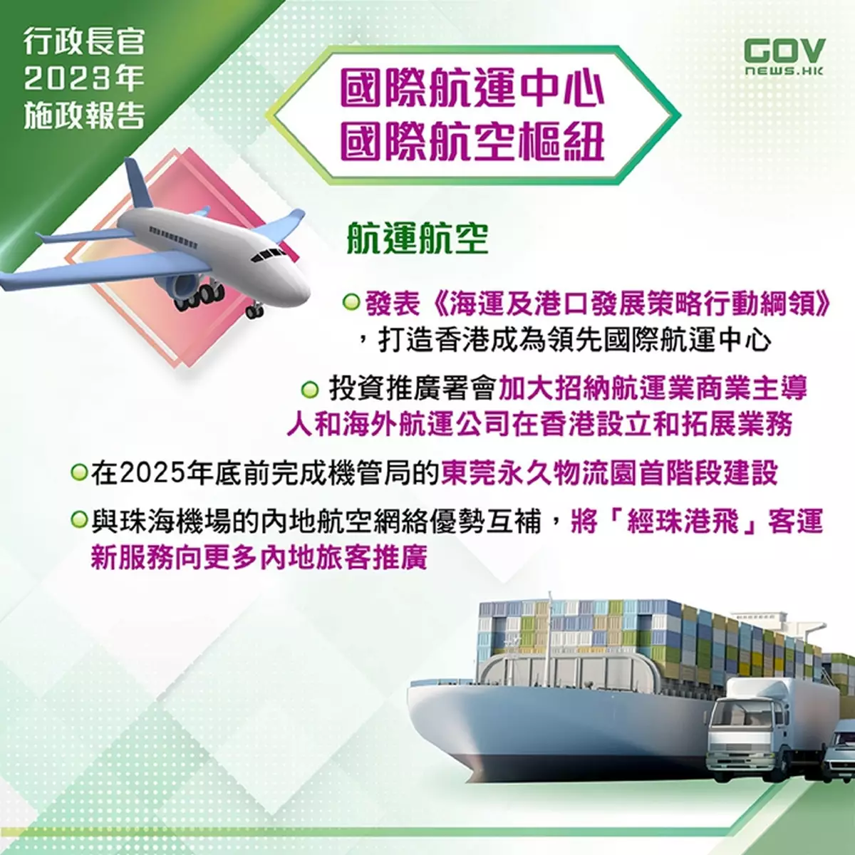 國際航空樞紐:推進三跑道工程和「機場城市」願景下各個項目,包括在2025年底前完成機管局的東莞永久物流園首階段建設等。