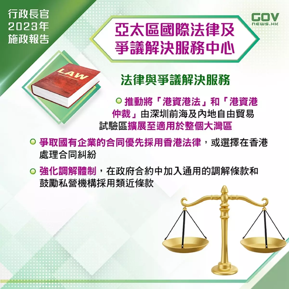 亞太區國際法律及爭議解決服務中心:將「港資港法」和「港資港仲裁」由深圳前海及內地自由貿易試驗區擴展至適用於整個大灣區,爭取國有企業採用香港法律作為合同適用法律,並選擇香港爭議解決服務處理合同糾紛,以及強化調解體制。