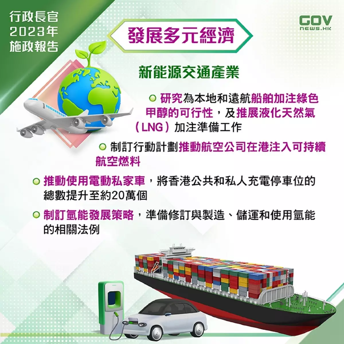 此外,政府會全力推動新能源交通產業,帶領業界綠色轉型,促進綠色經濟。