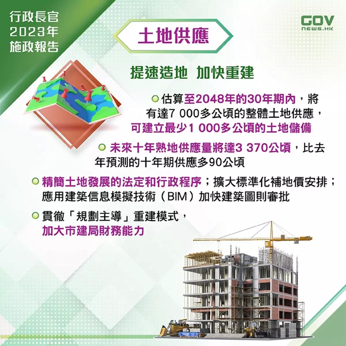 政府會繼續提速造地,並就市區樓宇老化推進重建和維修。政府亦會善用現有土地,釋放發展潛力,以及「一地多用」作混合發展。