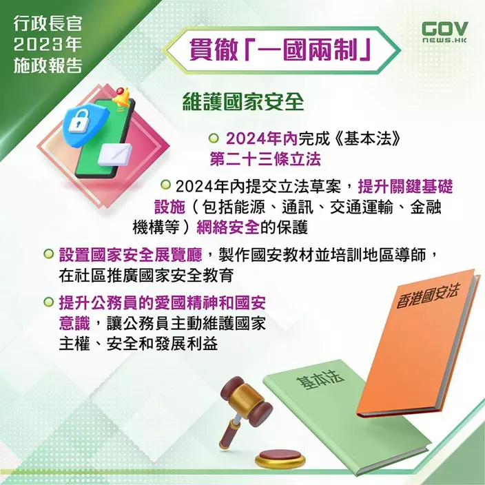 政府會全力維護國家安全,完善相關法律制度和執行機制,包括2024年內完成《基本法》第23條立法,以及為關鍵基礎設施網絡安全立法等,並開展愛國主義教育。