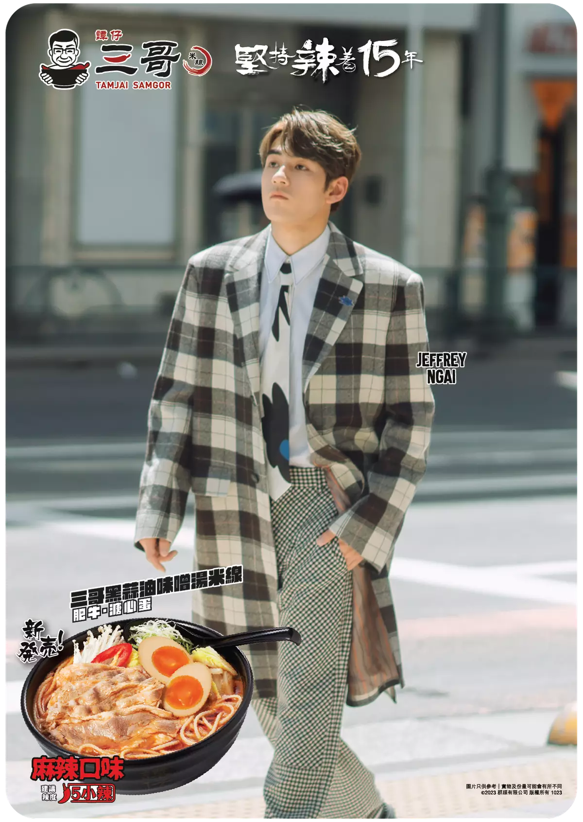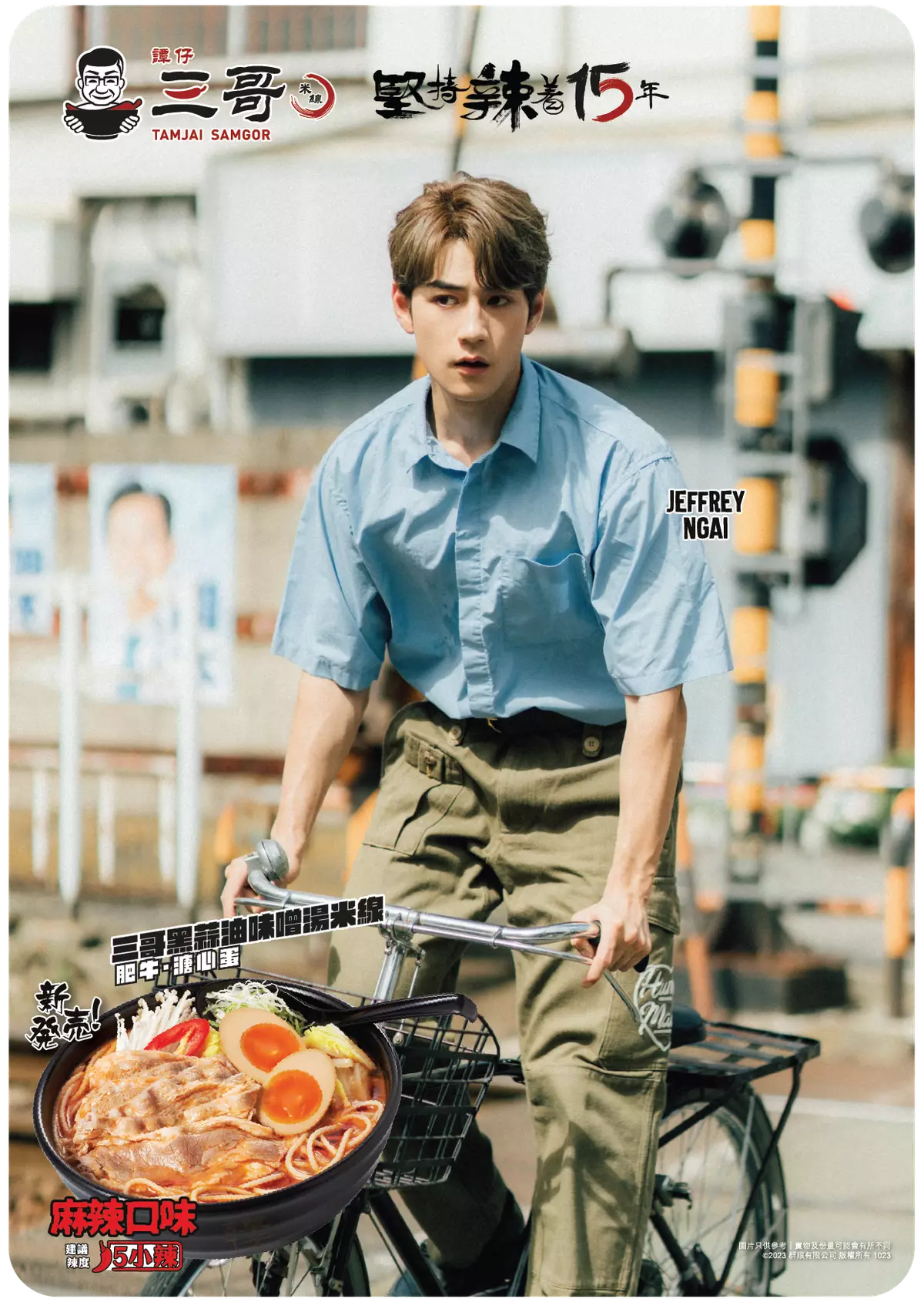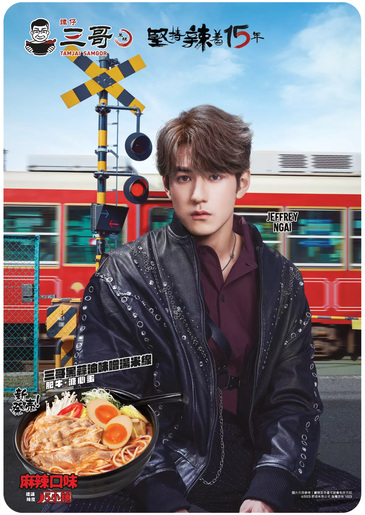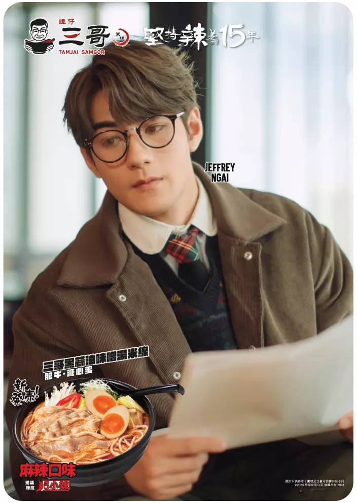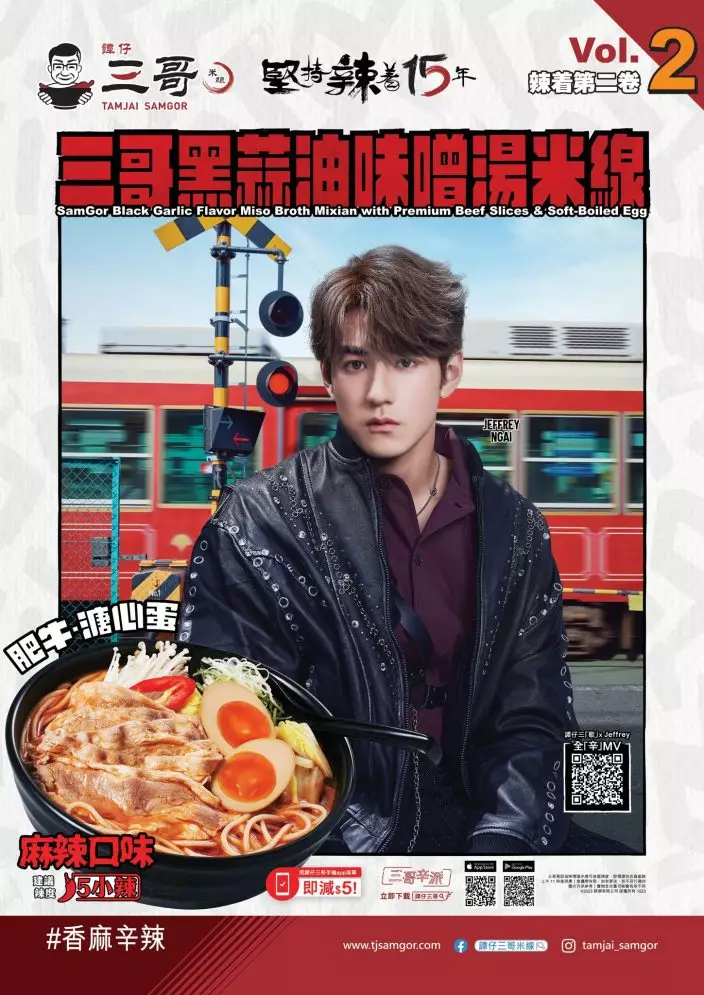 講到他在MV中被藤井莉娜「彈鐘」後,到日本譚仔三哥新宿分店品嚐米線以作安慰,Jeffery坦言現實中同樣視譚仔三哥為Comfort Food:「在香港遇到挫折時,我會食三哥為自己打氣,最勁我可以食到中辣。最近,當然食由我代言的『三哥黑蒜油味噌湯米線 | 肥牛‧溏心蛋』,湯底可選麻辣口味,更加刺激兼『熱血』,吃罷所有鬱結全消。而且今次在日本三哥能夠看到日本哥哥即席煮米線,是個新奇有趣的體驗,感受到人與人之間的交流,米線尚未入口已經能感受到它的溫度!」