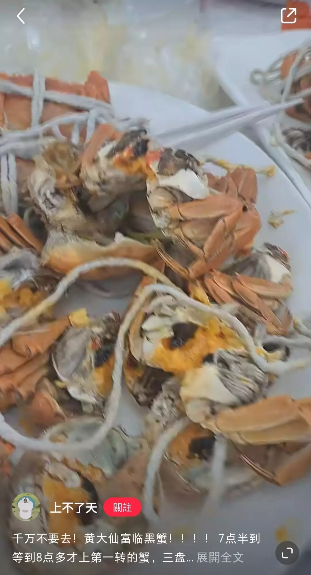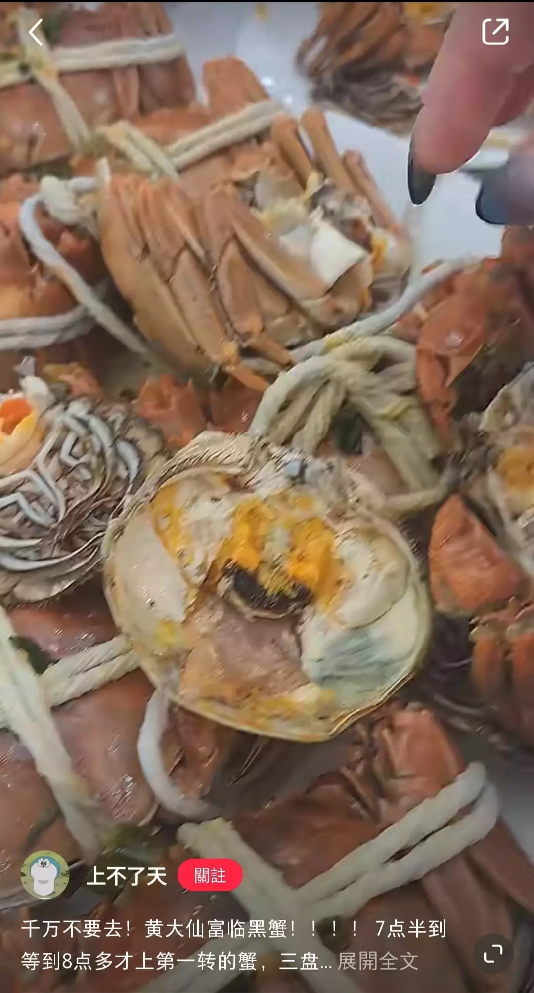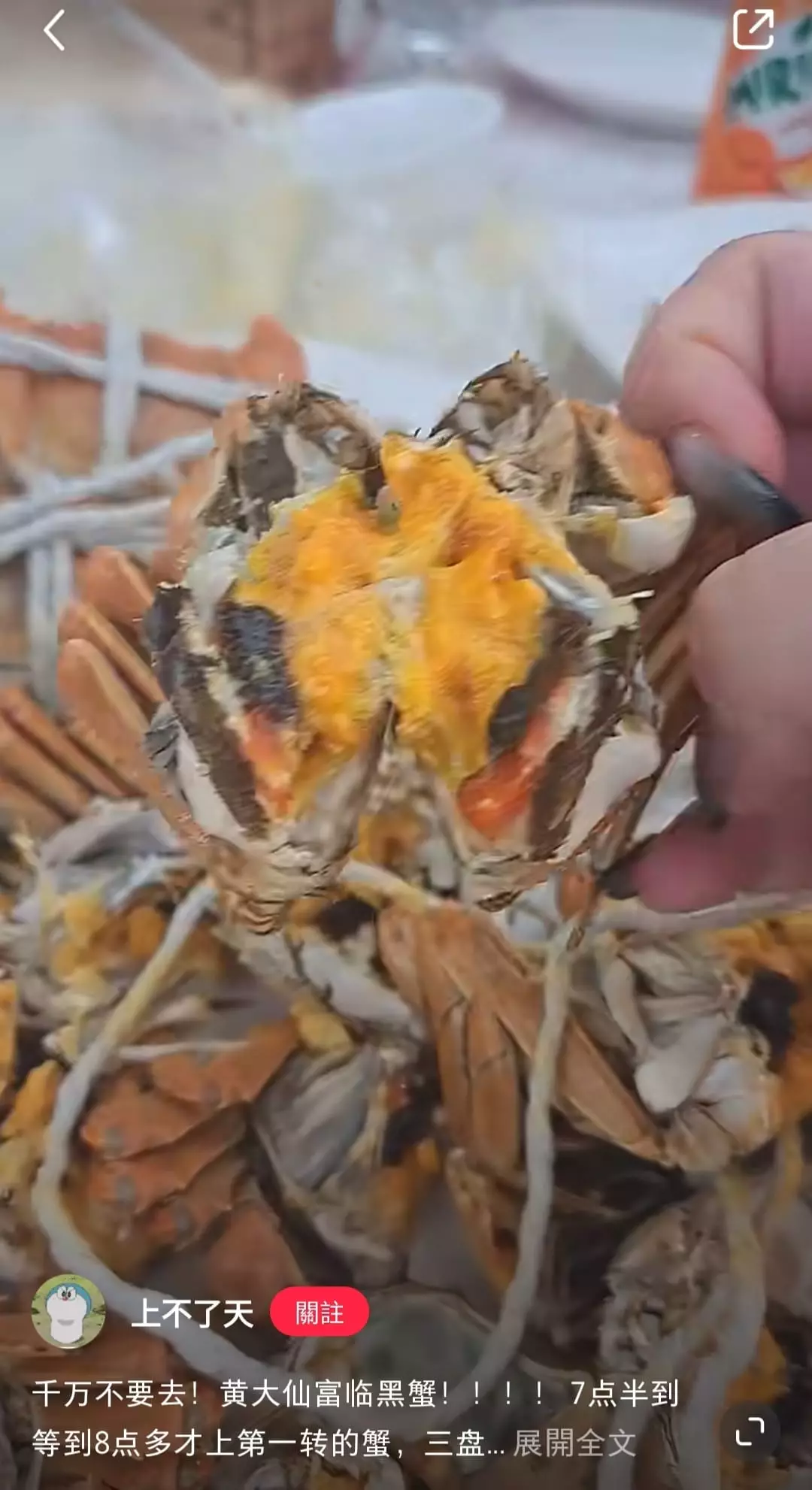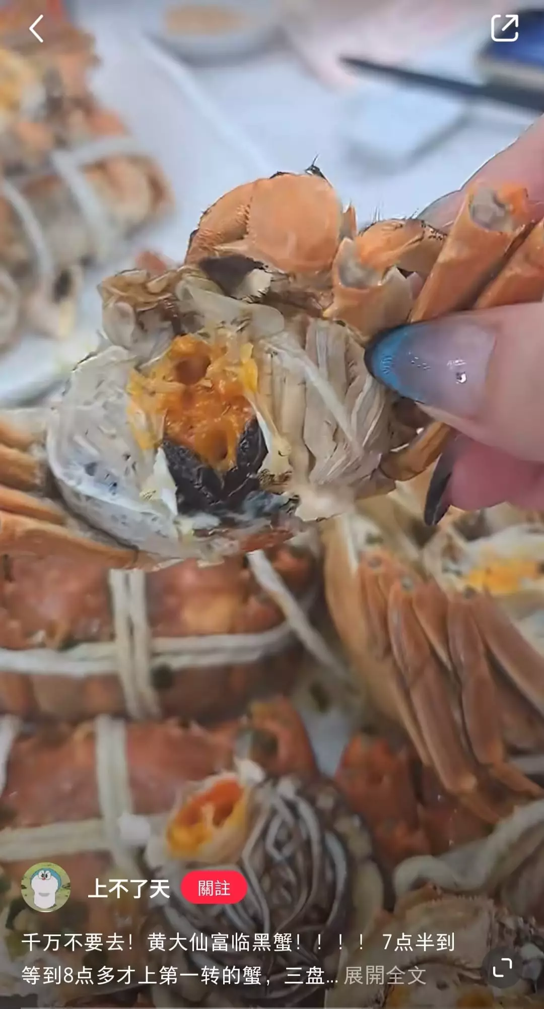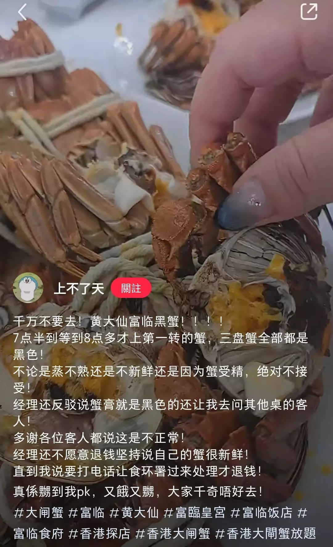 有女網民日前在小紅書以「千萬不要去!黄大仙XX黑蟹!!!!」為題發文,指日前在黃大仙一間連鎖酒樓食大閘蟹放題,從晚上7點半等到8點多才上第一轉蟹,未料打開蟹殼後,發現全盤蟹的蟹膏都是黑色,而且還有異味,「由開第一隻到開曬三碟都係黑,一隻都無食到,唔敢食,如果唔係真係會肚屙。」