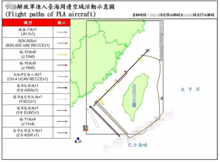 讓台軍頗為震驚的是,除了山東艦外,解放軍岸基飛機也大舉出動展開配合。從26日上午6時至27日上午6時,解放軍出動35架次軍機、15艘次軍艦持續在台海周邊活動;多架戰機在所謂「海峽中線」東側遠距離飛行。其中1架殲轟-7轟炸機穿越「海峽中線」北段,6架殲-10戰鬥機分多批次穿越「海峽中線」,6架殲-16戰鬥機分成兩批次穿越「海峽中線」以及台灣西南空域。另1架BZK-005無人機自東海一路向南飛行通過台灣和日本與那國島之間的空域,並在台灣東部外海空域繞圈後,再南下飛行進入巴士海峽上空,最後飛返大陸沿海;1架「彩虹-4」無人機穿越「海峽中線」進入台灣西南空域;1架運-8反潛機、1架運-9通信對抗機進入台灣西南空域;另有1架運-8電子偵察機、4架殲-11戰鬥機自東沙島東北方進入台灣西南空域。