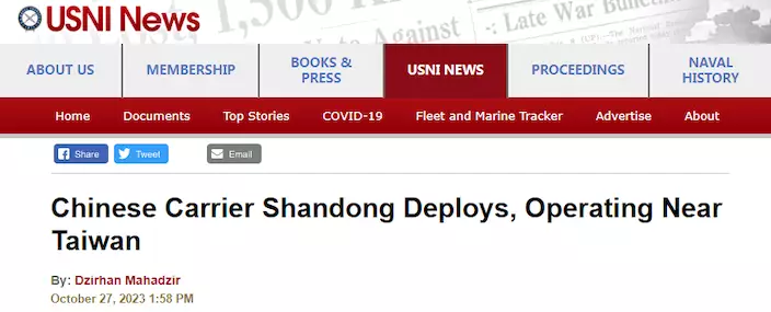 美國海軍學會網站27日報道稱,山東艦在今年內第三次部署到西太平洋地區,就在同一天,美國航母也出入同一海域。台灣防務部門26日發佈的聲明稱,山東艦通過巴士海峽進入西太平洋。「山東艦上一次被公開記錄到通過巴士海峽是在9月11日於台灣屏東鵝鑾鼻東南60海裡進入西太平洋航訓,隨後在9月15日途經巴士海峽,返回南海。」