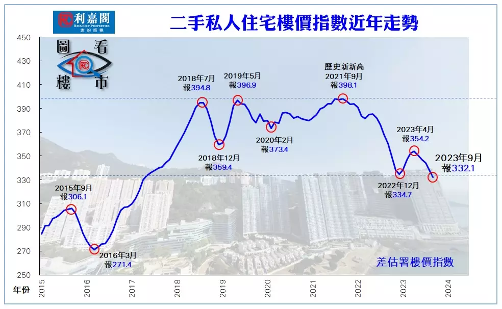 《施政報告》終為樓市減辣,料可緩和近半年的樓市跌勢,惟年內高息及經濟復甦進度緩慢仍將困擾後市,全年樓價恐難逃一跌。差估署日前公布的最新數據顯示,2023年9月份私人住宅售價指數報332.1點,較8月的338.0點再跌1.75%,連跌5個月。