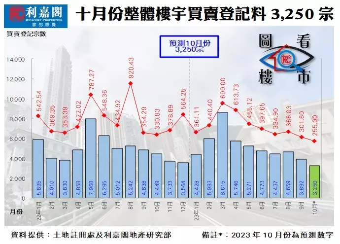 預測10月份市況,本地主要銀行於9月中下旬大幅調高新造樓按封頂息0.5厘,加上息口仍然高企趨升,並逢當時市場一度靜觀《施政報告》出台,交投極為淡靜,業主賣樓多要減價,故料下次公布的10月份樓價仍將維持約1.5%的跌幅。