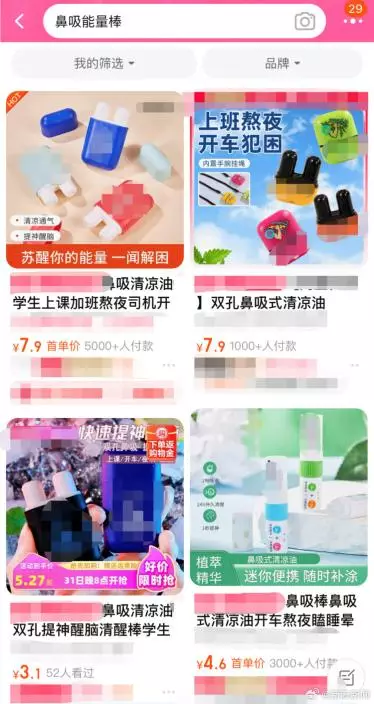據內媒報導,一款名為「鼻吸能量棒」的產品在內地中小學流行起來。這款產品外觀呈長方體,有蓋子,打開後可見兩根棒狀的吸口,使用者可以直接將其插入鼻孔進行吸入,以吸取能量棒內的薄荷精油等物質。