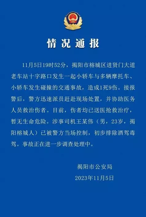 揭陽市公安局通報指,事件5日晚近8時,榕城區有私家車與多輛電單車及私家車發生碰撞,造成1死9傷。傷者已送院救治,無生命危險。肇事的23歲男司機已被警方當場拘捕,初步排除酒駕毒駕。事故正在進一步調查處理中。
