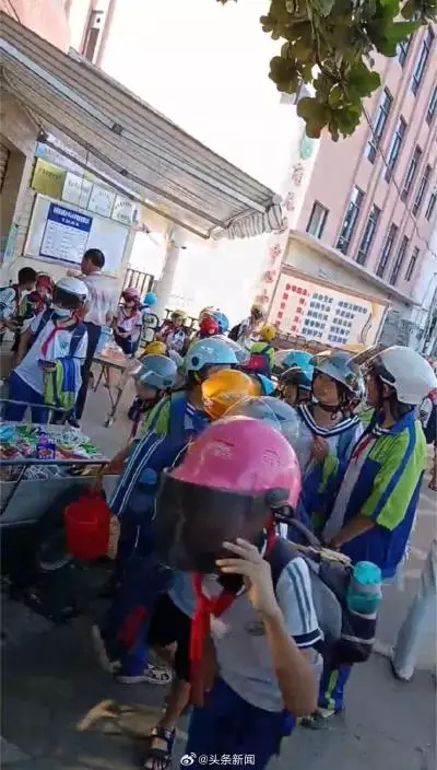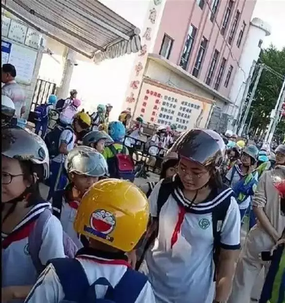 廣東湛江市徐聞縣角尾鄉中心小學近日要求所有學生戴頭盔上、下學,有網民稱學生連行路、搭車也要戴頭盔。網傳影片顯示,在角尾鄉中心小學校門口,陸續有幾十名學生佩戴頭盔走出校門,僅一名學生將頭盔拿在手上,且影片中沒有出現電單車、電動車。