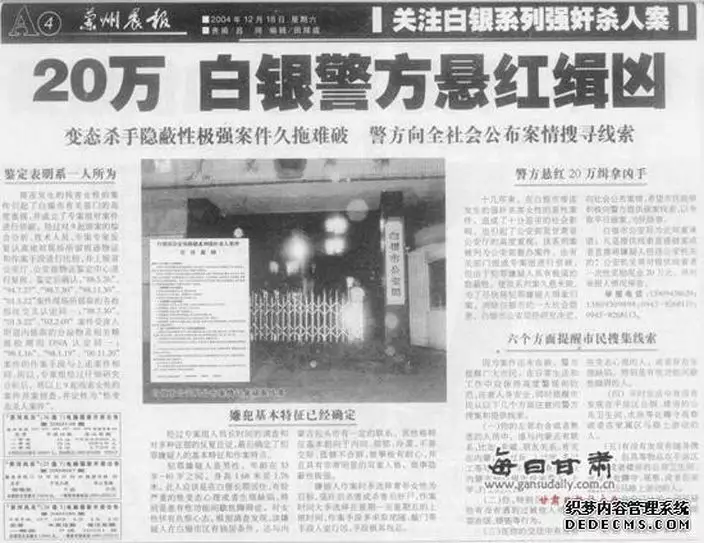 《新京報》報道,蘭州市榆中縣農民高承勇,在一九八八年至二○○二年間瘋狂作案,在甘肅白銀殺害九人,內蒙古包頭殺害兩人。大部分作案時間是在工作日的白天,兇手在長期觀察後或者跟蹤受害者後,直接進入女子家中,強姦殺害或姦屍。有居民稱,「當年整個白銀都籠罩在殺人狂的陰影下,氣氛真的很恐怖,每個女人出門都不敢穿大紅色衣服。」