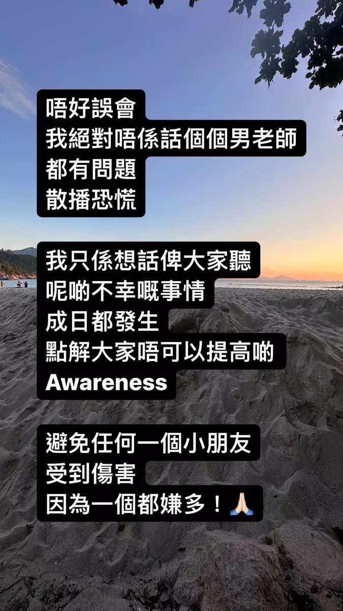官恩娜又表示:「唔好誤會,我絕對唔係話個個男老師都有問題,散播恐慌,我只係想話俾大家聽呢啲不幸嘅事情成日都發生,點解大家唔可以提高啲Awareness(意識),避免任何一個小朋友受到傷害,因為一個都嫌多!」她又詢問網民:「請問所有受害人嘅父母送小朋友去補習社...興趣班etc...之前會唔會諗到會有啲事發生呢?如果佢哋打電話去詢問有冇閉路電視可能得到嘅答案都同我一樣...」最後,她強調:「我係希望有閉路電視保障返雙方嘅安全同權利,唔係怕有閉路電視睇蝕我個女。」