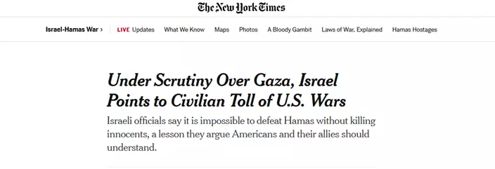 《紐約時報》表示,以色列方面這麽做,是因爲他們認爲美國人及其盟友應該理解,如果不殺害無辜,就不可能打敗哈馬斯。