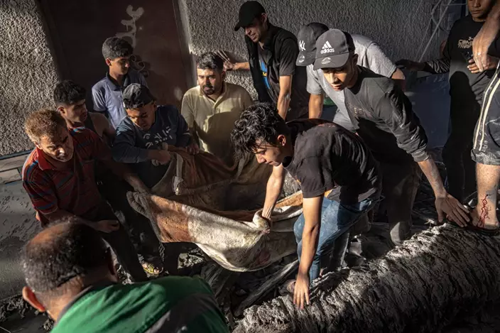 11月7日,以色列空襲難民營後,巴勒斯坦人正在疏散一名受傷男子。AP圖片