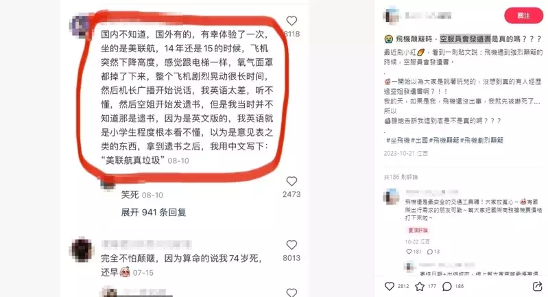 日前,內地一名帖主以「飛機顛簸時,空服員發遺書是真的嗎?」為題在小紅書上發文詢問網友。他表示近期在小紅書驚見有旅客分享曾在國外搭機時遭遇劇烈晃動的留言,讓他倍感好奇。由他曬出的留言截圖可見,該名旅客聲稱搭機時飛機突然下降高度,猶如坐電梯般,甚至連氧氣面罩也掉了下來,其情況十分危急。