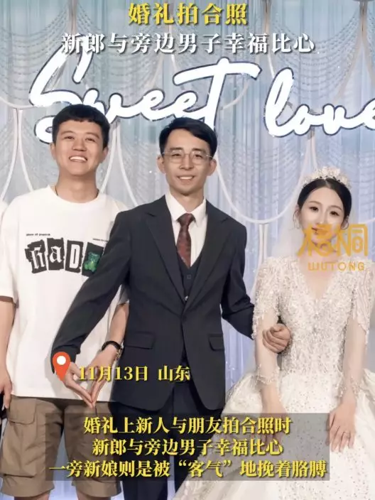 日前,內地山東省一場婚禮上演了逗趣一幕,當天在一場婚禮的合照環節中,本應該是主角的新娘意外遭好友「搶鏡」而顯得有些多餘。影片可見,新郎和他旁邊一名男性朋友合照時,2人竟悄悄地在做出了「比心」手勢,看起來十分幸福,而另一邊的新娘則被有些「客氣」地攙扶著,仿若她才是賓客一樣,畫面相當滑稽。