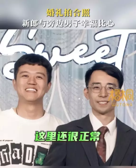 照片曝光後,網友們紛紛留言戲謔:「一時分不清楚究竟是誰與誰結婚」、「新娘:開心不起來,不過新郎很開心」、「哈哈哈,笑死我了,這樣的合照到底是誰和誰結婚」、「這也太搞笑了吧,現在年輕人真的是古靈精怪」、「他兩才是真愛」、「新娘貌似是來湊數的」。