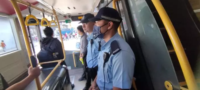 警員上車後先向車長介紹登車巡邏細節,隨後站在車廂空位。該次巡邏經過3個巴士站,期間警員會站於車廂內,觀察車內情況,如無特別,不會與乘客交流。