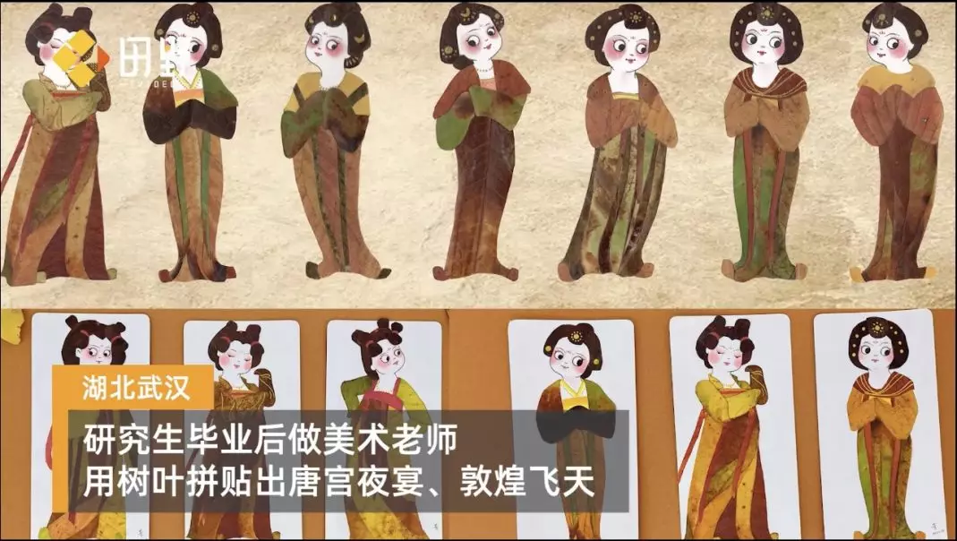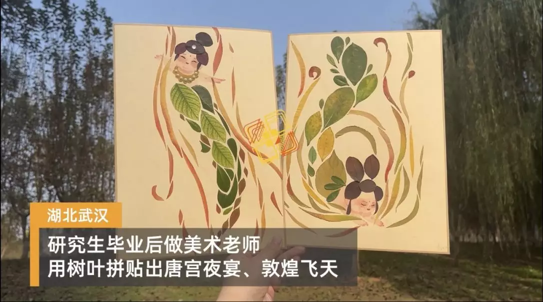 日前,湖北武漢一名老師利用樹葉做成藝術品的行為吸引了眾多關注。任芳自研究生畢業後成為了一名美術老師,她常常以獨特的方式去激發學生們的創造力,她表示每當秋季來臨,她都會在放學的路上撿拾沒人要的樹葉,並將這些看似普通的葉子加工做成精緻的藝術作品,如唐宮夜宴、敦煌飛天等古代美女形象。