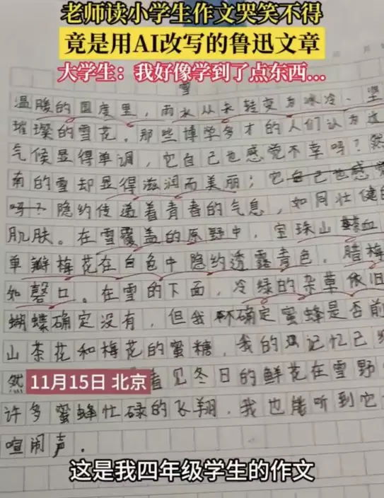近日,內地北京一名小學老師在給四年級學生批改作文時,驚訝地發現該學生的作文有些熟悉,看了幾遍後他才發現原來該篇作文是根據知名作家魯迅的文章《雪》進行改寫的,他立即詢問學生家長。影片可見,老師向家長說明瞭學生改寫魯迅文章一事,並讓家長瞭解下其改寫過程。