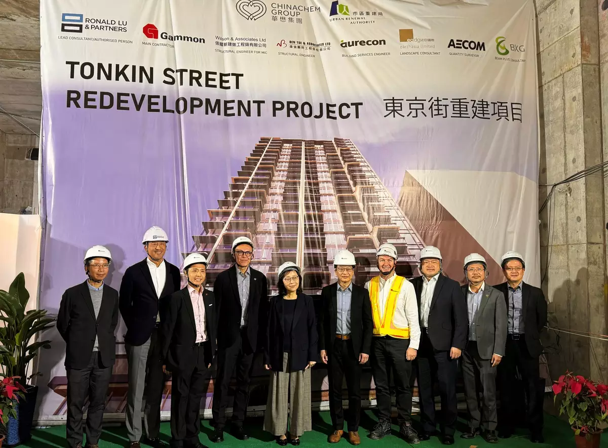 發展局局長甯漢豪到訪深水埗東京街一個私人住宅項目工地,有關項目由發展商與市區重建局合作發展,亦是本港首次有發展商以混凝土組裝合成建築法興建私人住宅。