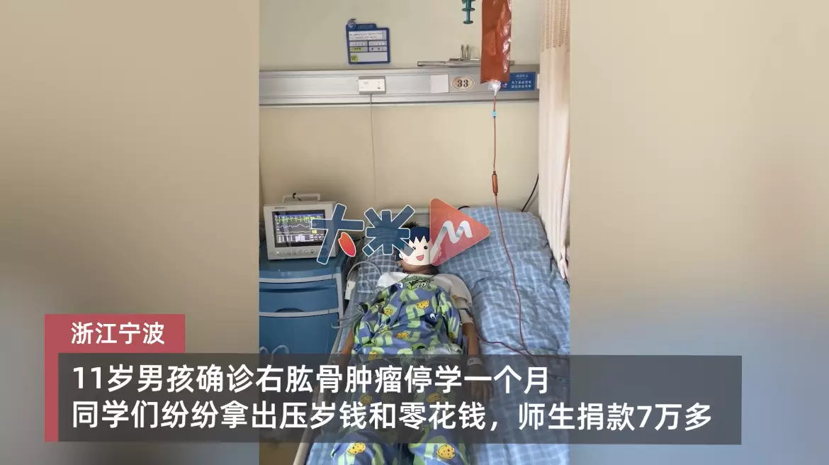 日前,浙江寧波一名就讀小學六年級的11歲男童被診斷出患有右肱骨腫瘤停學一個月,該消息一經傳出,便引起了男童就讀學校師生的廣泛關注與同情,老師們紛紛進行愛心援助,而同學們也紛紛拿出自己的壓歲錢和零花錢,短短三天內就籌集了7萬元(人民幣,下同,約7萬6港元)的捐款。