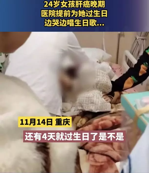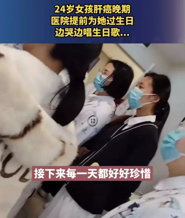 據內媒報導,內地重慶1名24歲女子患有晚期肝癌,由於病情發現太晚,無法進行手術,因而只能提前在醫院度過她的24歲生日。當天該名女子在醫護人員和家人陪伴下慶祝生日,護士們細心地為她戴上生日帽,準備了蛋糕,並和親友一起唱生日歌。